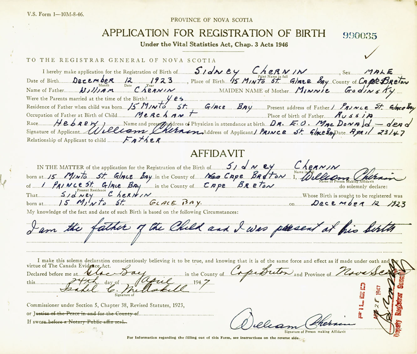 Signature of Applicant William Chernin Address of Applicant 1 Prince Street, Glace Bay, Cape Breton Co., NS Date 23 April 1947