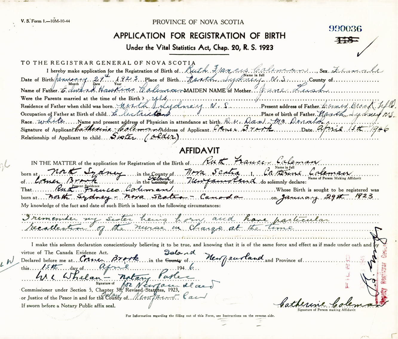 Signature of Applicant Catherine Coleman Address of Applicant Cornerbrook, Newfoundland Date 15 April 1946