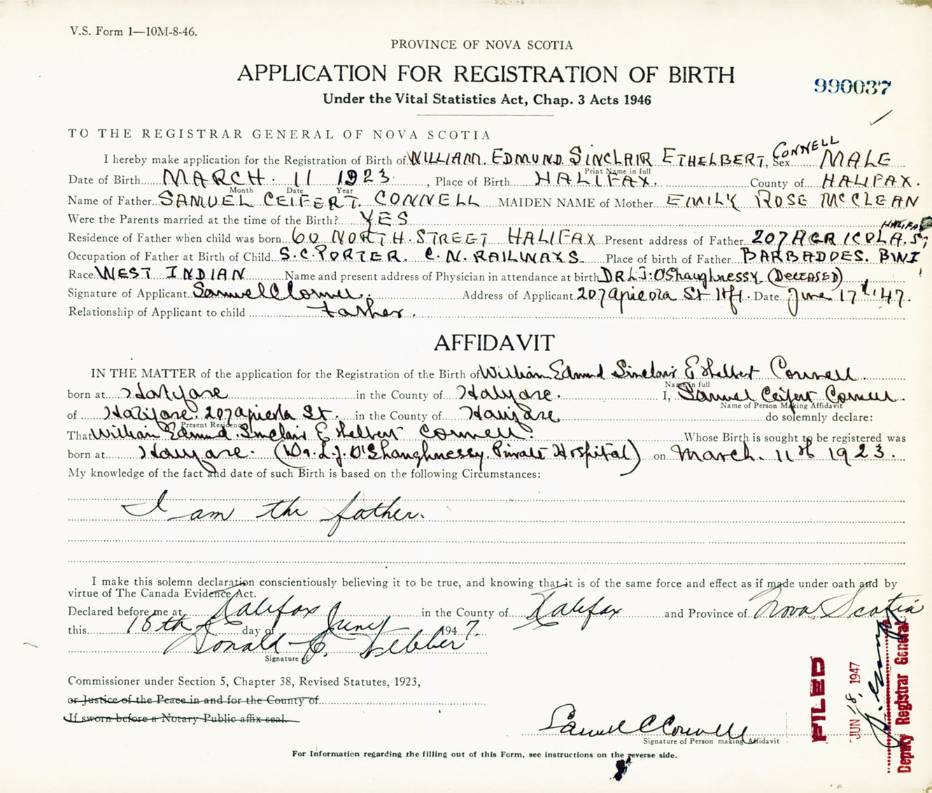 Signature of Applicant Samuel Connell Address of Applicant 207 Agricola Street, Halifax, NS Date 17 June 1947