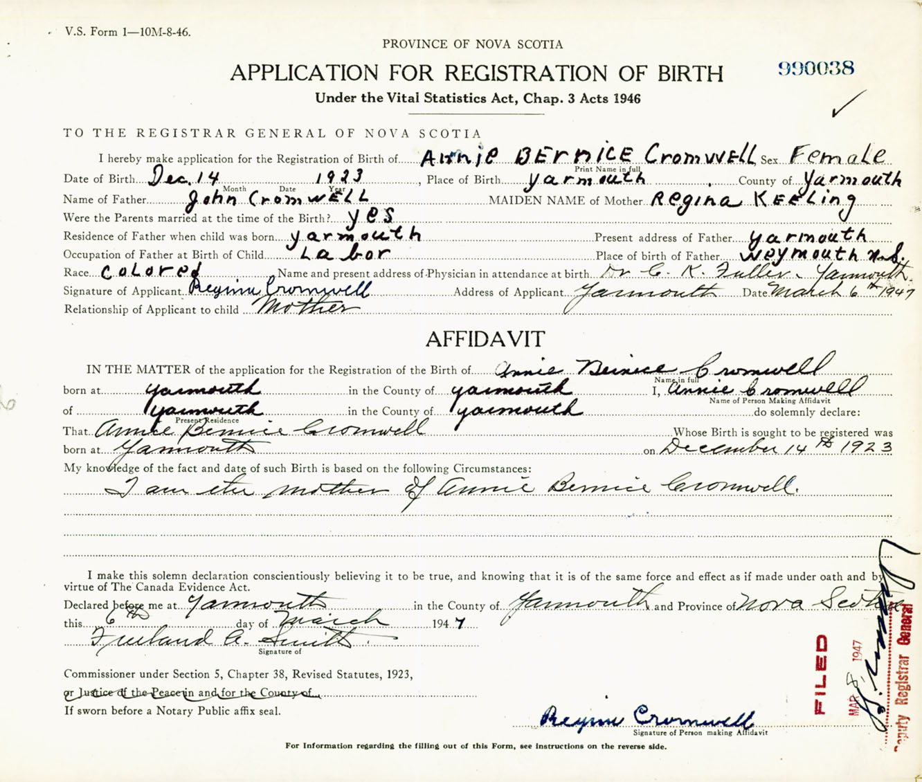 Signature of Applicant Regina Cromwell Address of Applicant Yarmouth, NS Date 6 March 1947