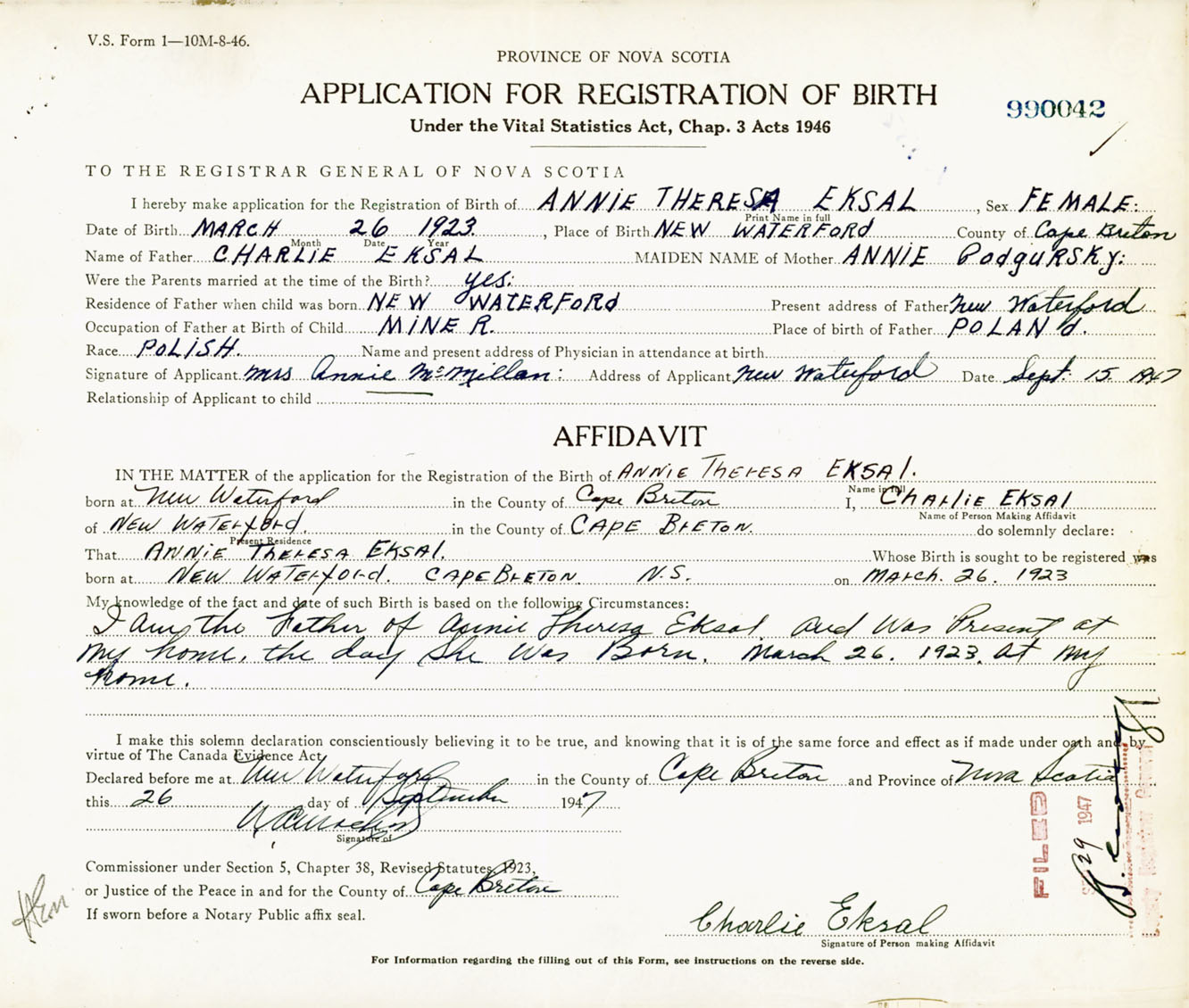 I am the father of Annie Theresa Eksal and was present at my home the day she was born. March 26, 1923 at my home.