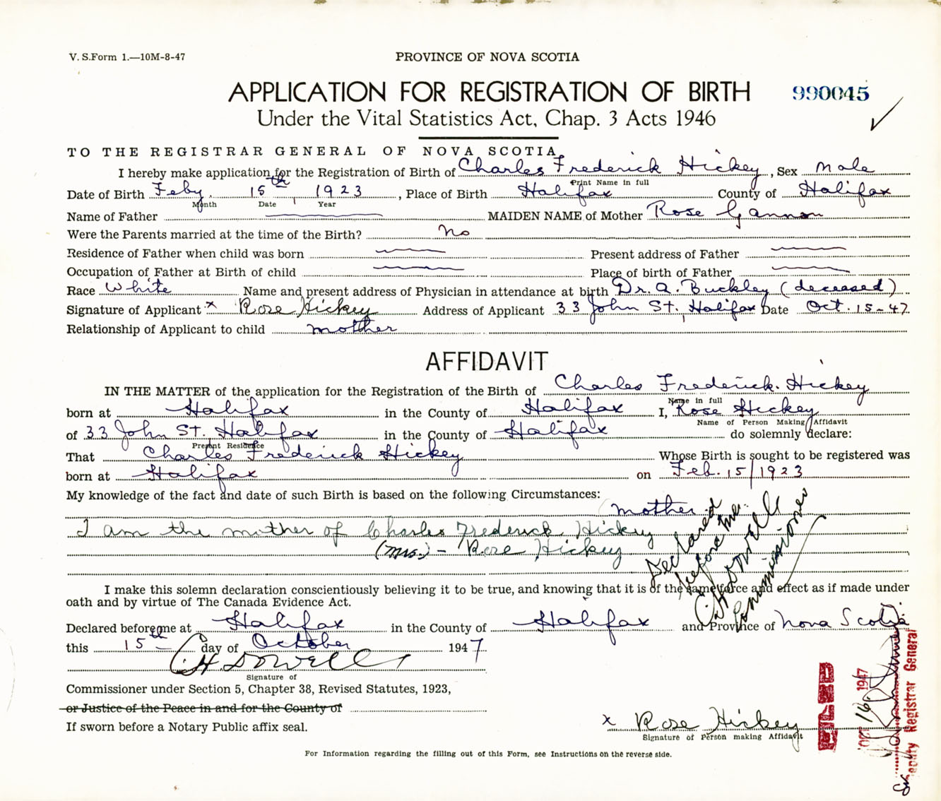 Signature of Applicant Rose Hickey Address of Applicant 33 John Street, Halifax, NS Date 15 October 1947