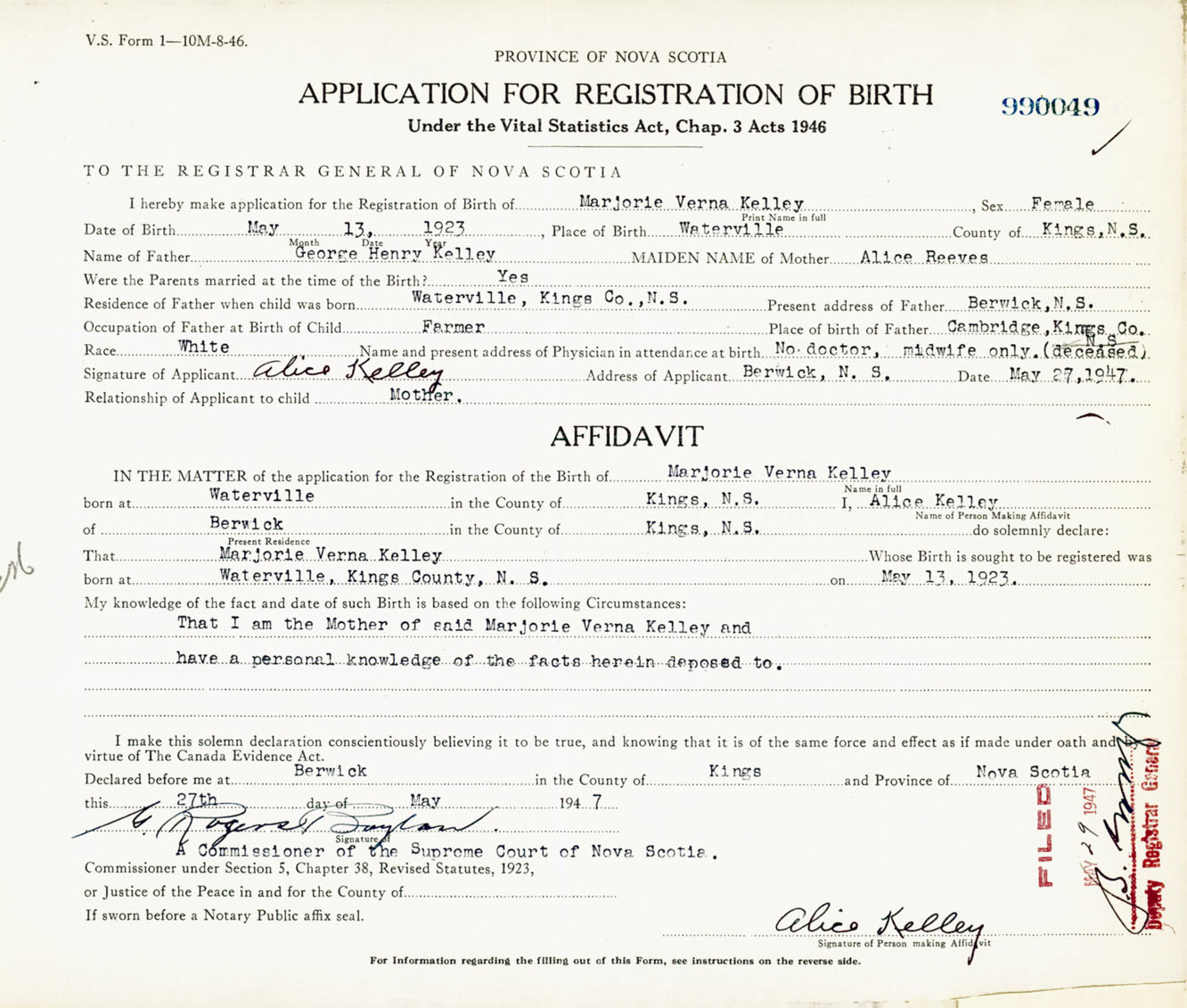 Signature of Applicant Alice Kelley Address of Applicant Berwick, Kings Co., NS Date 27 May 1947