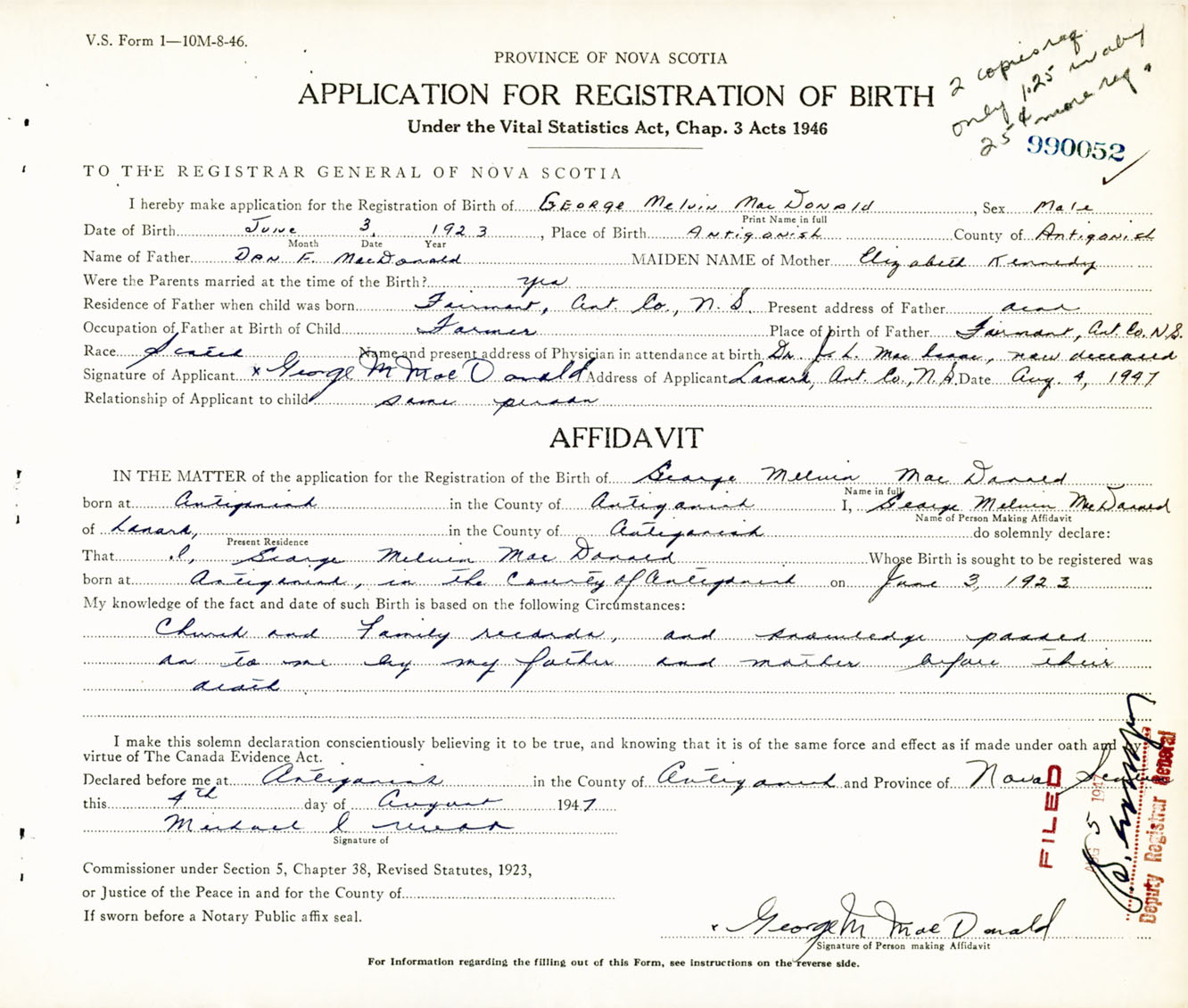 Signature of Applicant George M. MacDonald Address of Applicant Lanark, Antigonish Co., NS Date 4 August 1947