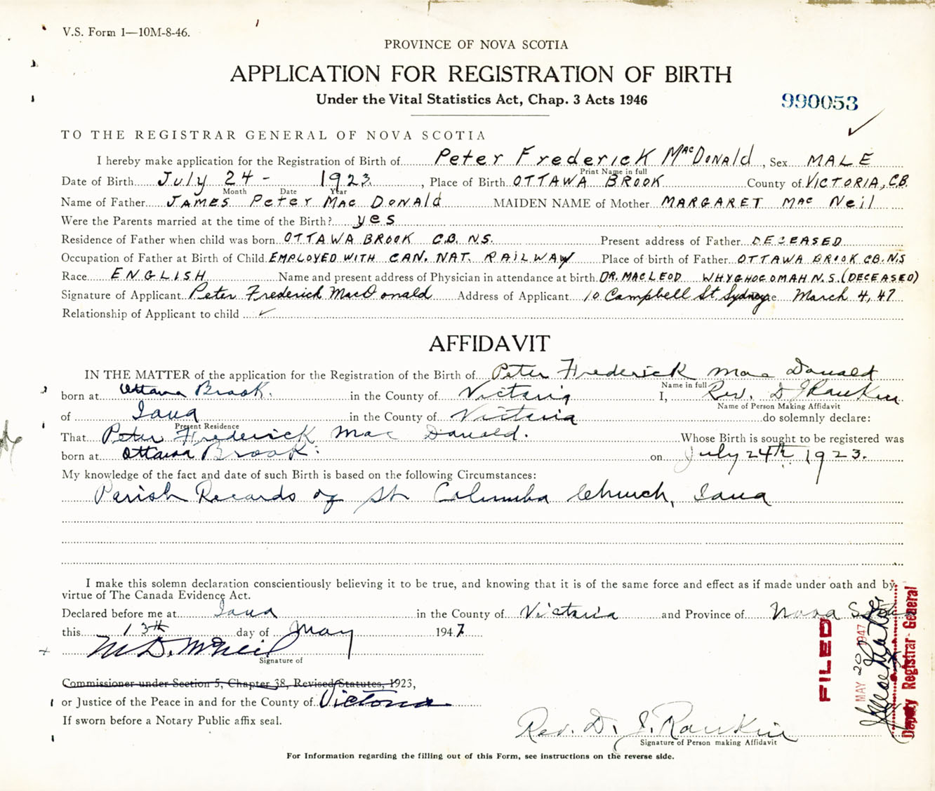Signature of Applicant Peter Frederick MacDonald Address of Applicant 10 Campbell Street, Sydney, Cape Breton Co., NS Date 4 March 1947