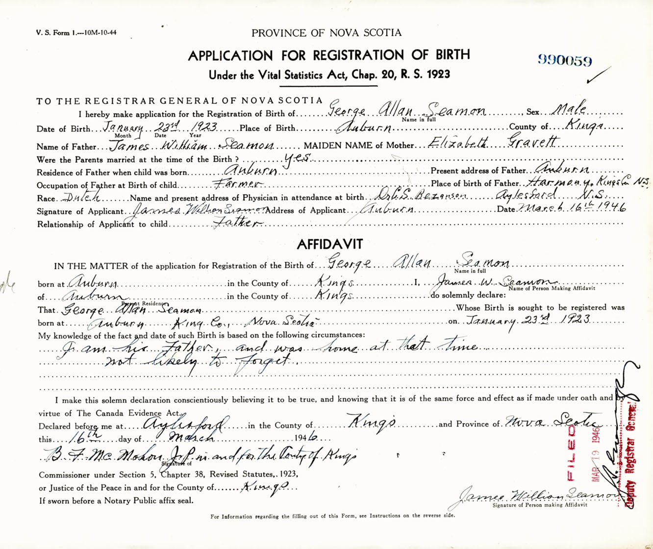 Signature of Applicant James William Seamon Address of Applicant Auburn, Kings Co., NS Date 16 March 1946