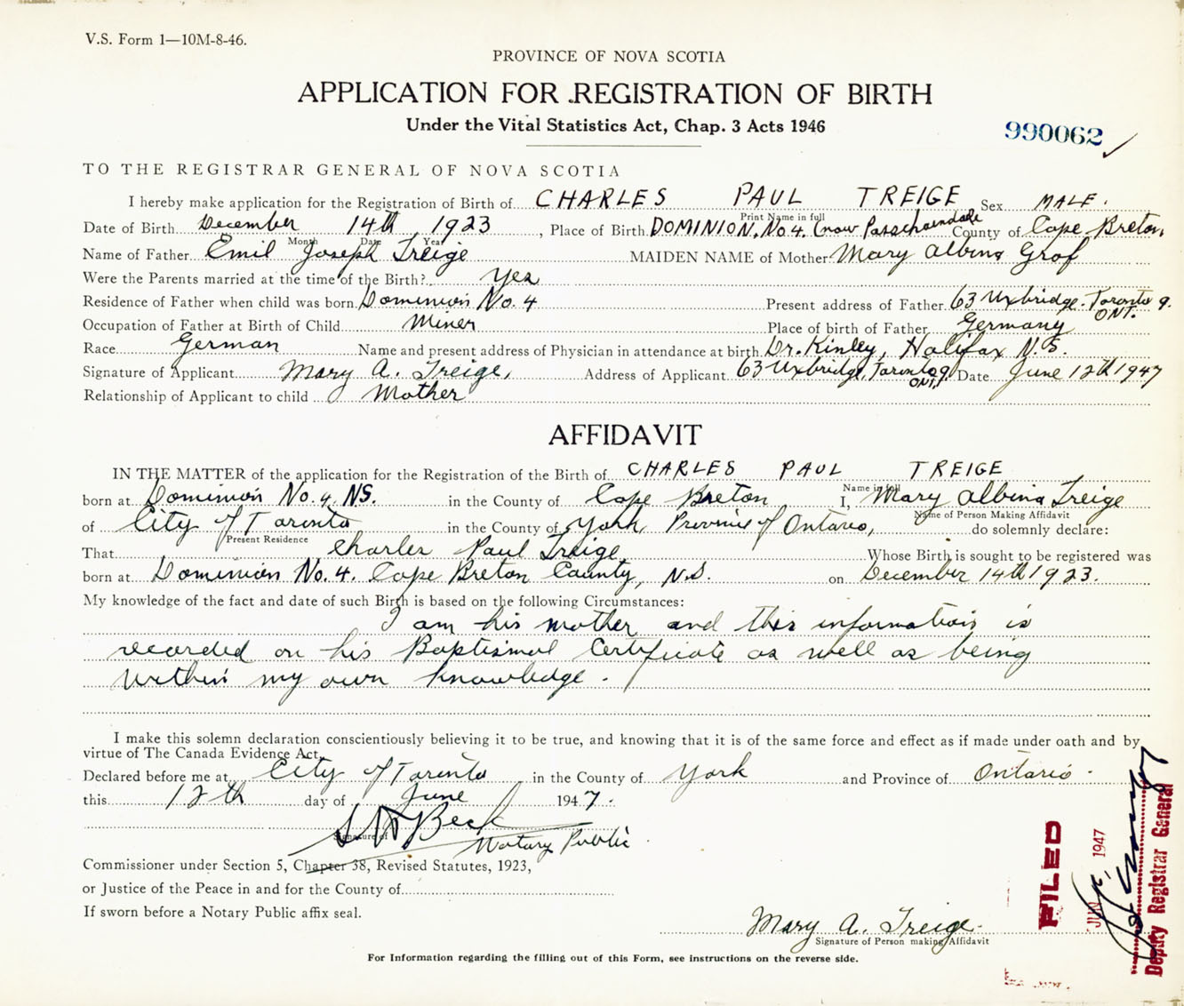 Signature of Applicant Mary A. Treige Address of Applicant 63 Uxbridge, Toronto, Ontario Date 12 June 1947
