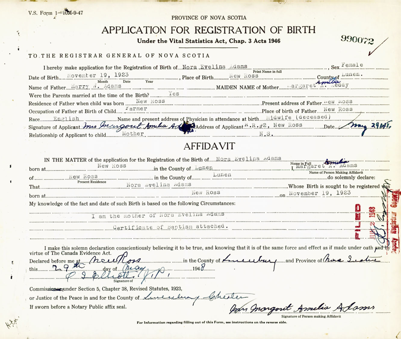 Signature of Applicant Mrs. Margaret Amelia Adams Address of Applicant RR #2, New Ross, Lunenburg Co., NS Date 29 May 1948