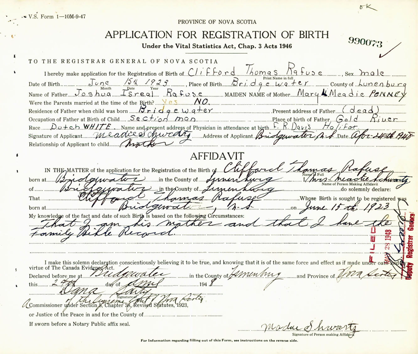 Signature of Applicant Meadie Schwartz Address of Applicant Bridgewater, Lunenburg Co., NS Date 24 April 1948