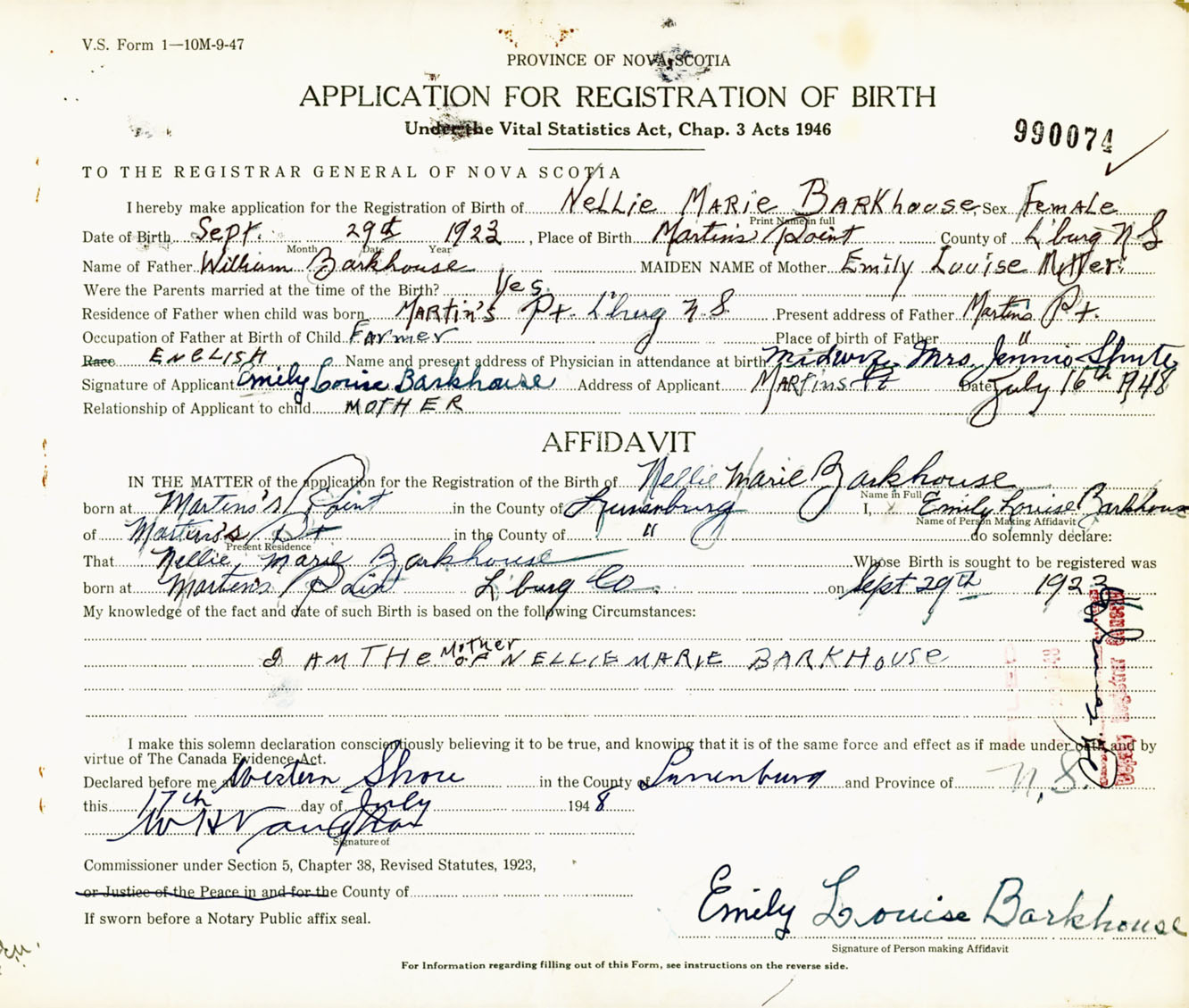 Signature of Applicant Emily Louise Barkhouse Address of Applicant Martins Point, Lunenburg Co., NS Date 16 July 1948