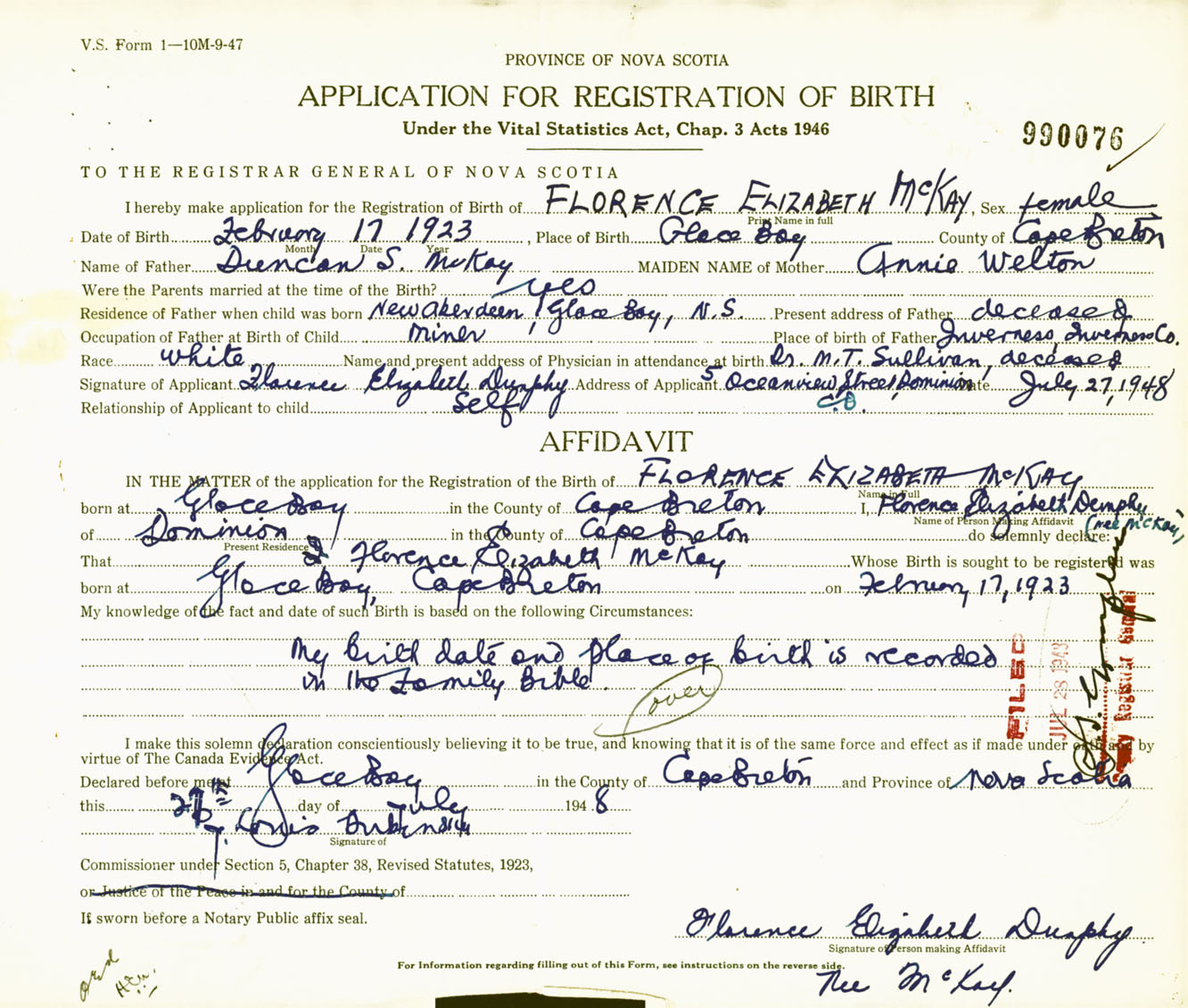 Signature of Applicant Florence Elizabeth Dunphy Address of Applicant 5 Oceanview Street, Dominion, Cape Breton Co., NS Date 27 July 1948