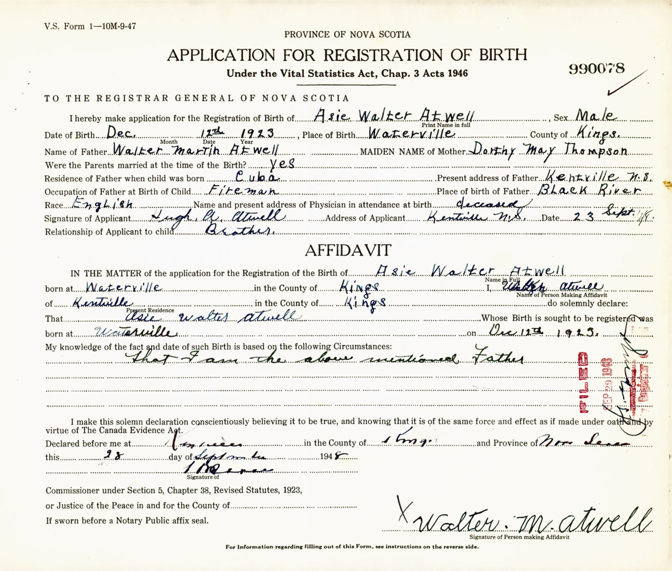 I hereby make application for the Registration of Birth of Asie WalterAtwell Sex Male