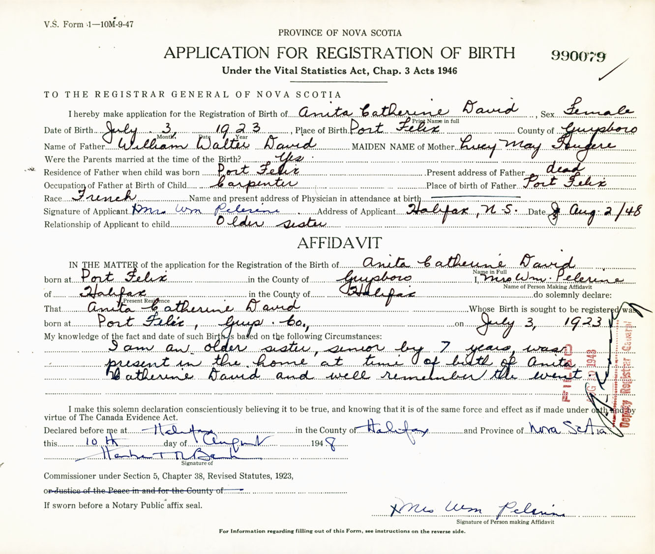 Signature of Applicant Mrs. William Pelerine Address of Applicant Halifax, NS Date 2 August 1948