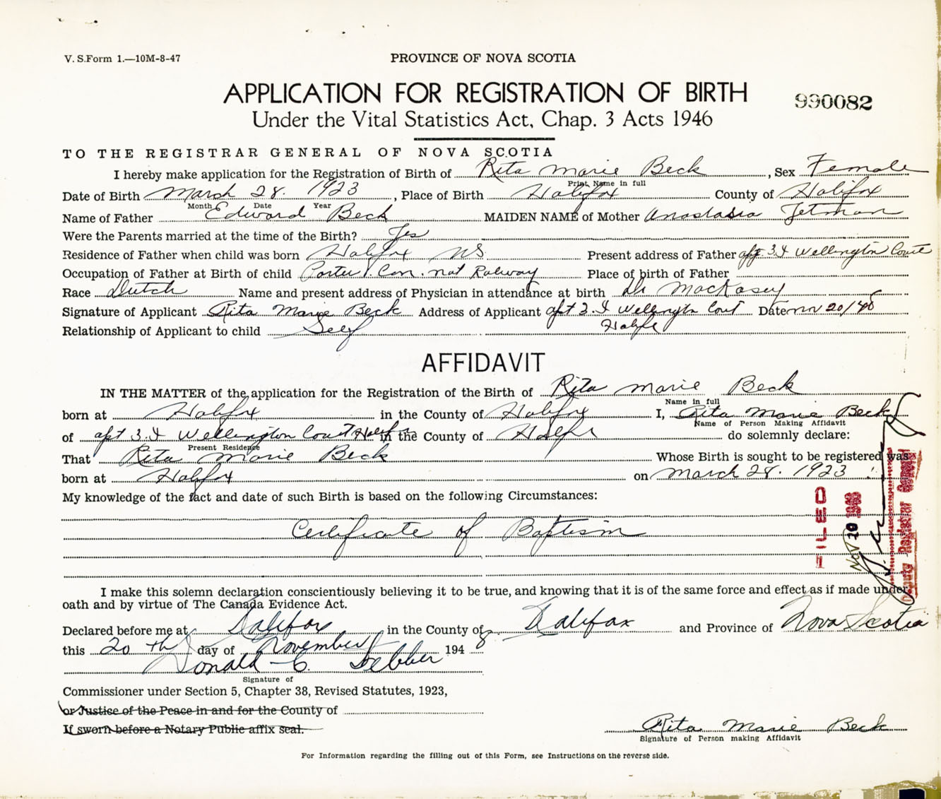 Signature of Applicant Rita Marie Beck Address of Applicant 4 Wellington Court, Apt 3, Halifax, NS Date 20 November 1948