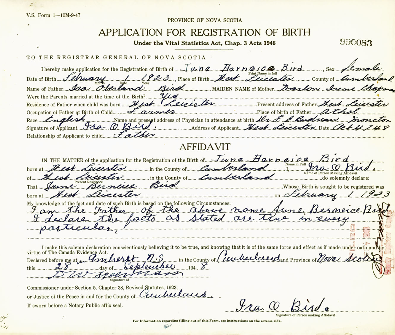 I hereby make application for the Registration of Birth of June BerneiceBird Sex Female