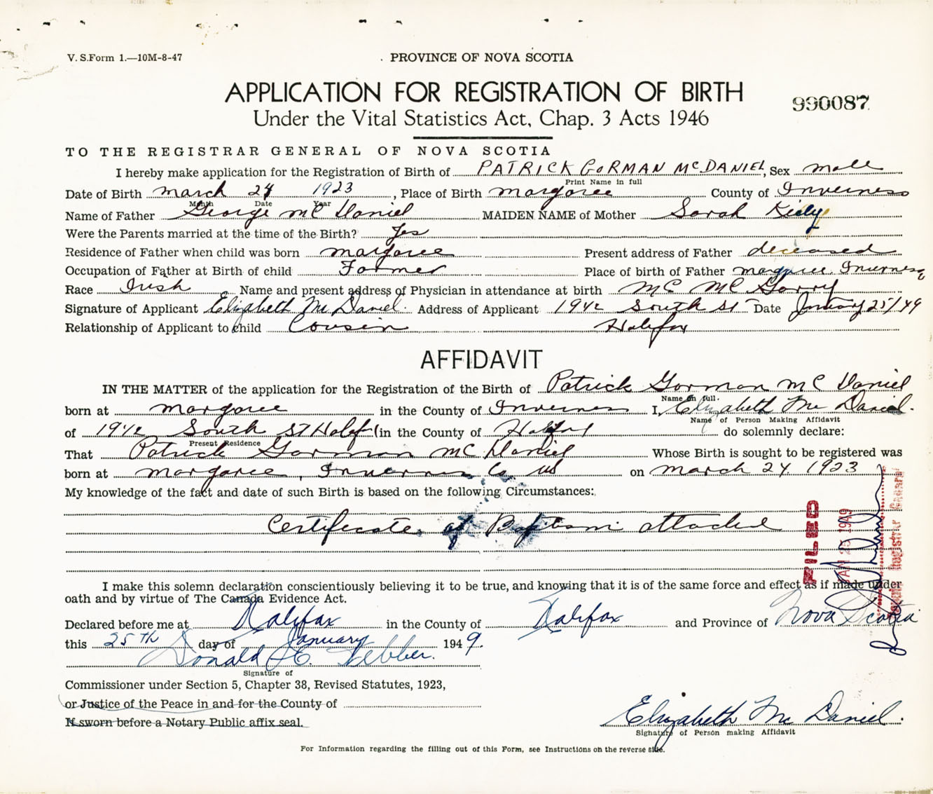 I hereby make application for the Registration of Birth of Patrick GormanMcDaniel Sex Male