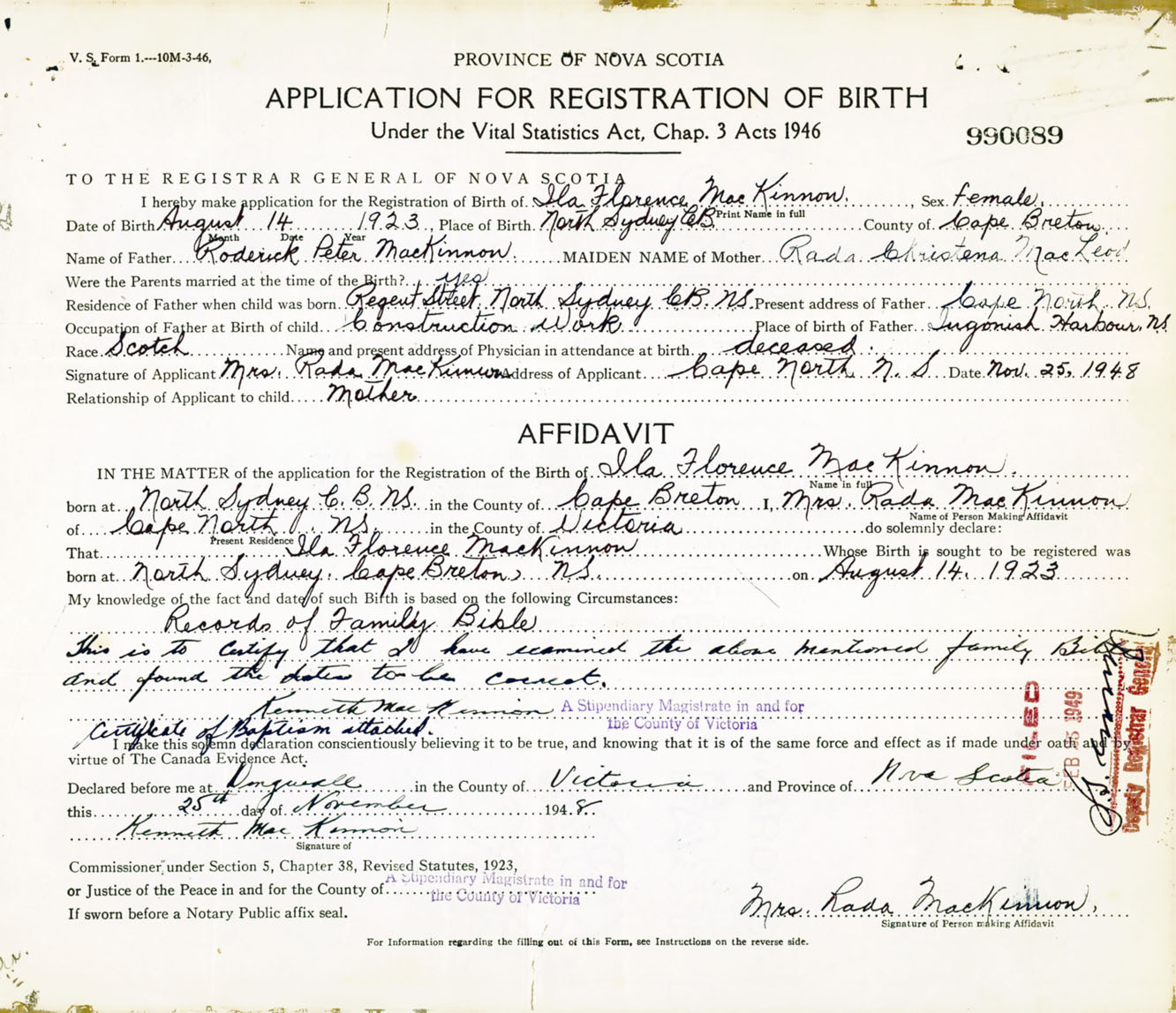 Signature of Applicant Mrs. Rada MacKinnon Address of Applicant Cape North, Victoria Co., NS Date 25 November 1948