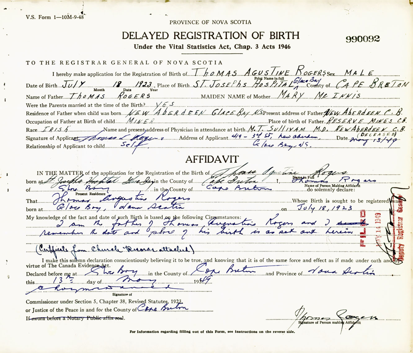 Signature of Applicant Thomas Rogers Address of Applicant 419 3rd Street, New Aberdeen, Glace Bay, Cape Breton Co., NS Date 13 May 1949
