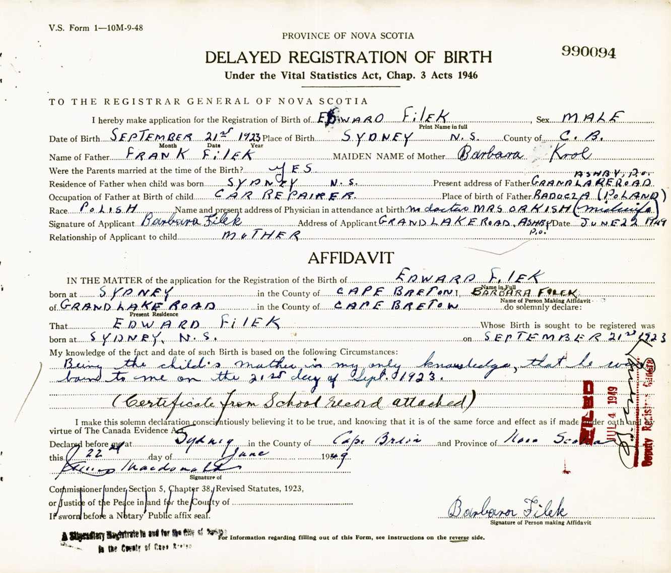Signature of Applicant Barbera Filek Address of Applicant Ashby Post Office, Grand Lake Road, Cape Breton Co., NS Date 22 June 1949