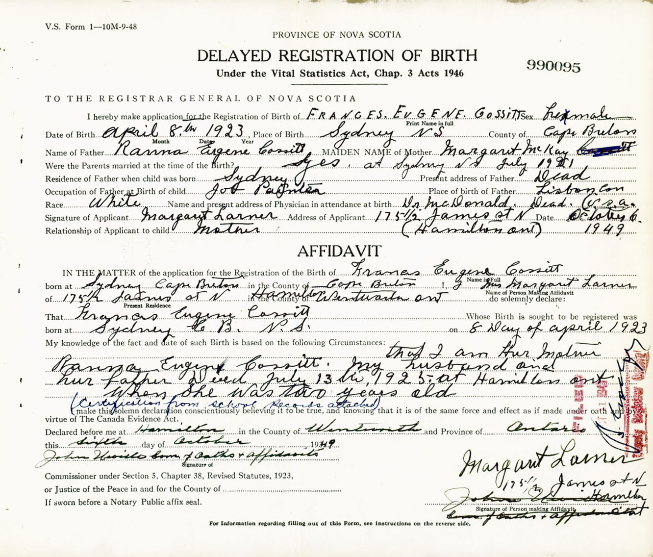 Signature of Applicant Margaret Larner Address of Applicant 175 1/2 James Street North, Hamilton, Ontario Date 6 October 1949