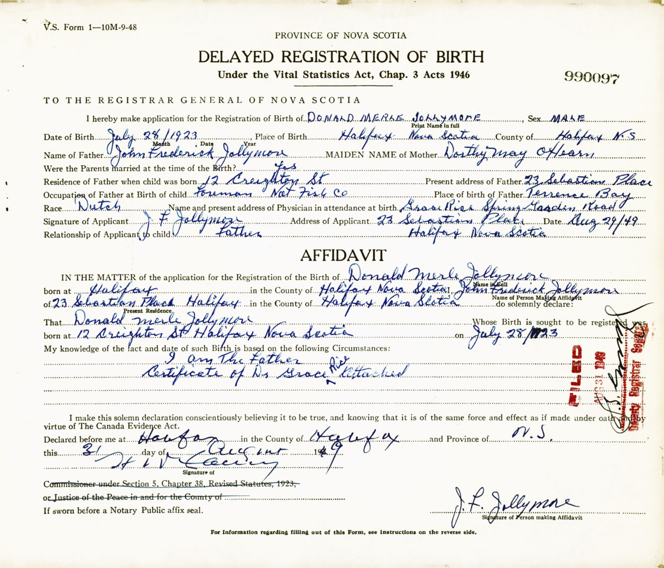 Signature of Applicant J. F. Jollymore Address of Applicant 23 Sebastian Place, Halifax, NS Date 29 August 1949