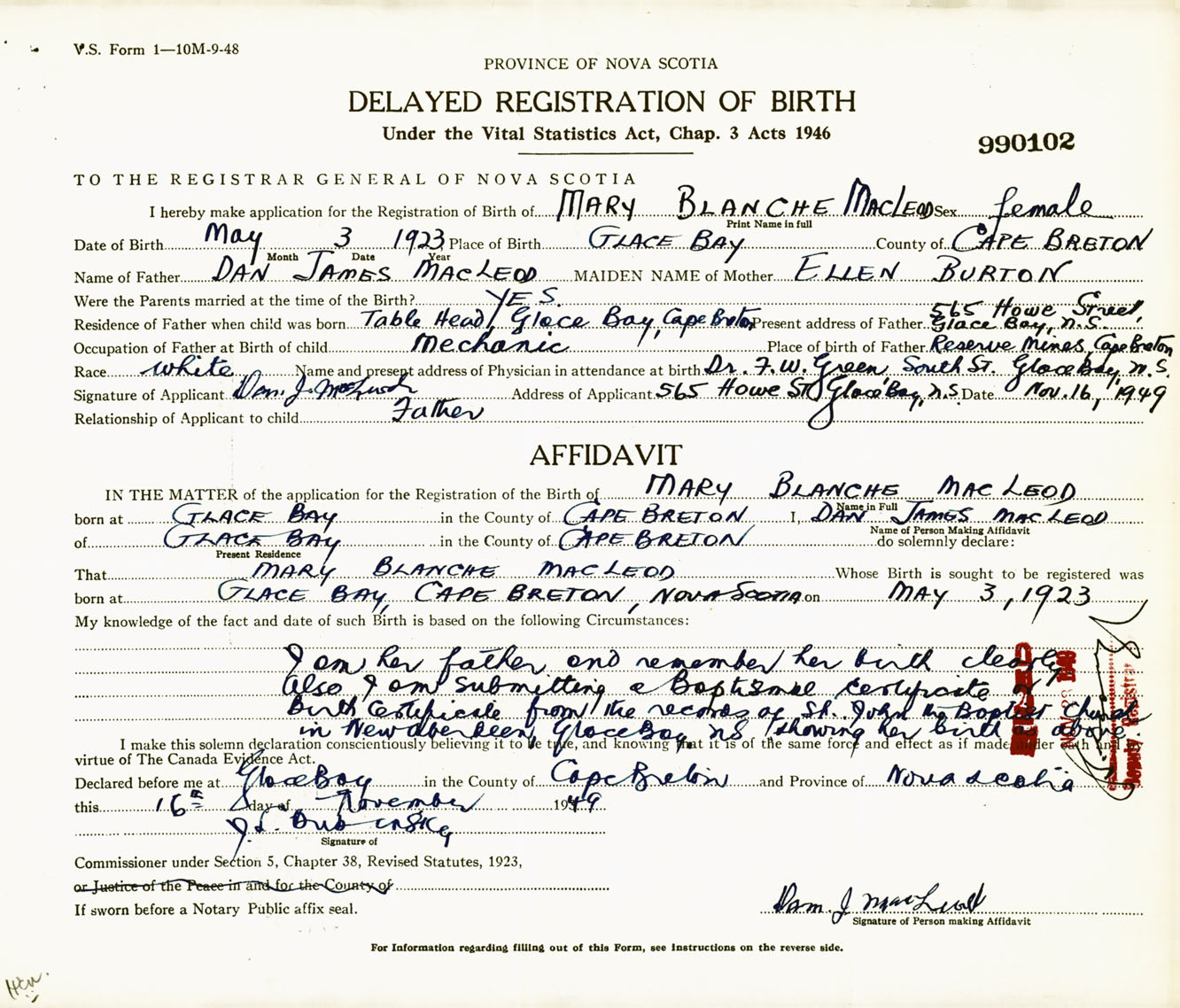 I hereby make application for the Registration of Birth of Mary BlancheMacLeod Sex Female