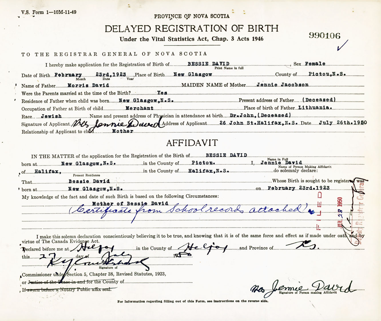 Signature of Applicant Mrs. Jennie David Address of Applicant 26 John Street, Halifax, NS Date 26 July 1950