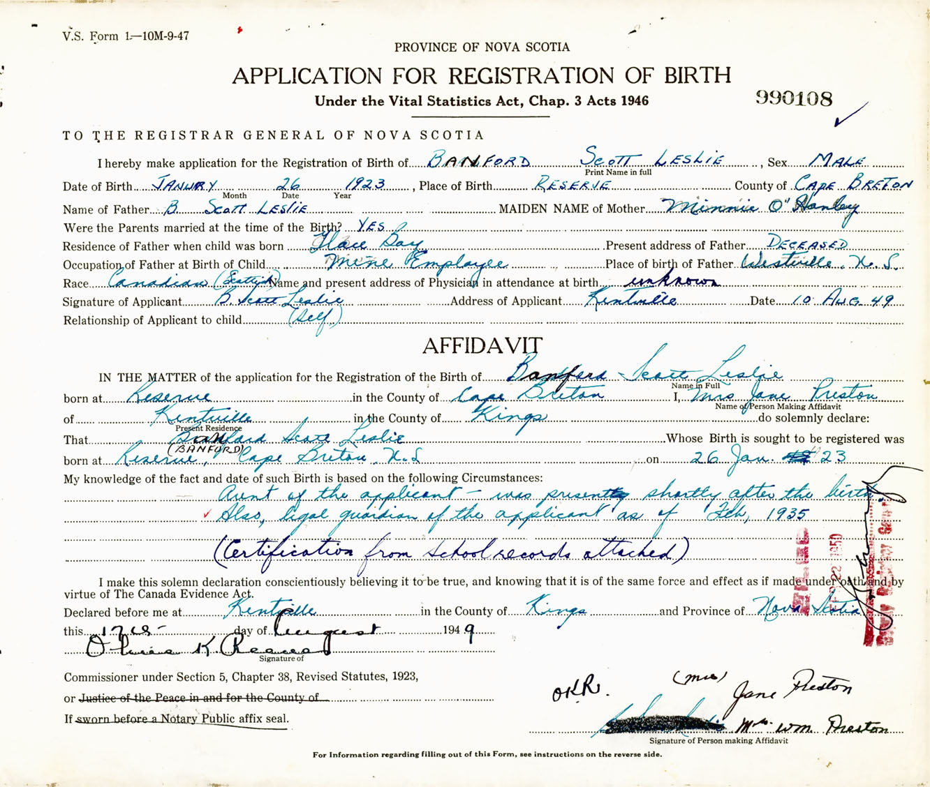 Signature of Applicant B. Scott Leslie Address of Applicant Kentville, Kings Co., NS Date 10 August 1949