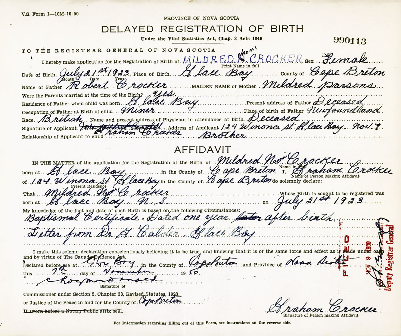 Signature of Applicant Graham Crocker Address of Applicant 124 Winona Street, Glace Bay, Cape Breton Co., NS Date 7 November 1950
