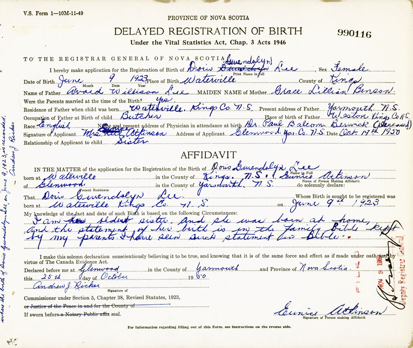 Signature of Applicant Mrs. Eunice Atkinson Address of Applicant Glenwood, Yarmouth Co., NS Date 19 October 1950