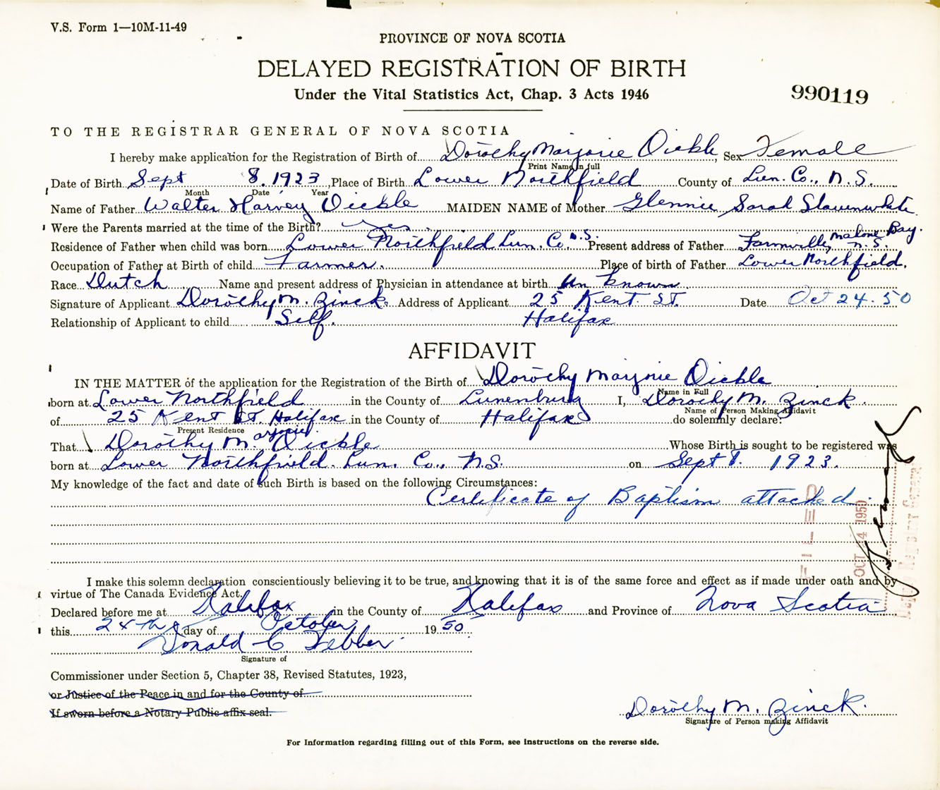 Signature of Applicant Dorothy M. Zinck Address of Applicant 25 Kent Street, Halifax, NS Date 24 October 1950