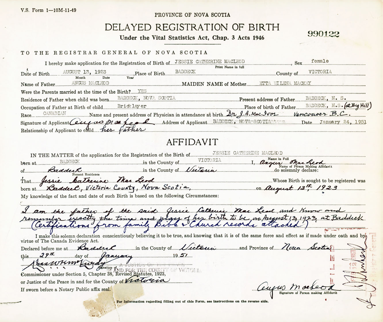 I am the father of the said Jessie Catherine MacLeod and know and remember exactly the time and place of her birth to be on August 13, 1923 at Baddeck. (Certifications from family bible and Church records attached)
