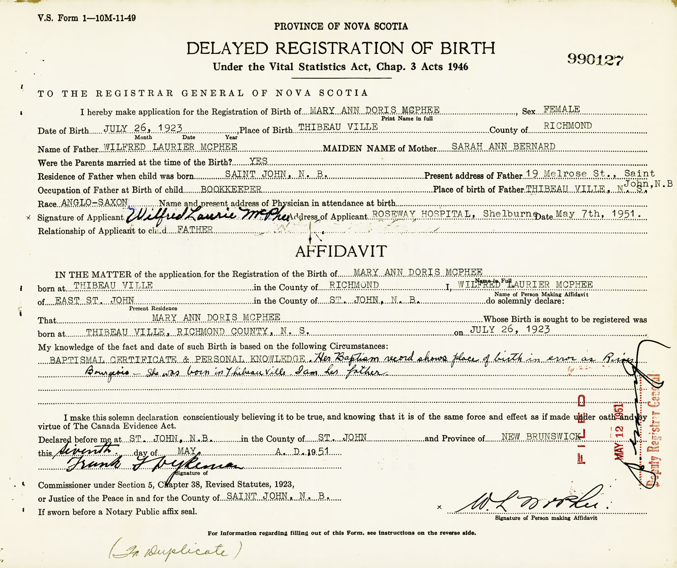 I hereby make application for the Registration of Birth of Mary Ann DorisMcPhee Sex Female