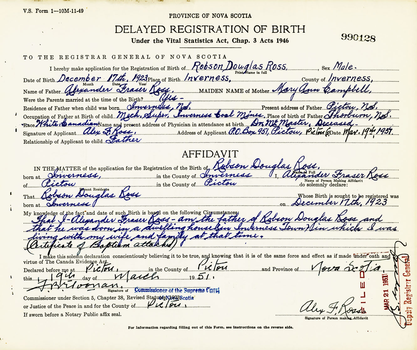 That I, Alexander Fraser Ross, am the father of Robson Douglas Ross and that he was born in a dwelling house in Inverness Town in which I was living with my wife and family at that time. (Certificate of baptism attached)