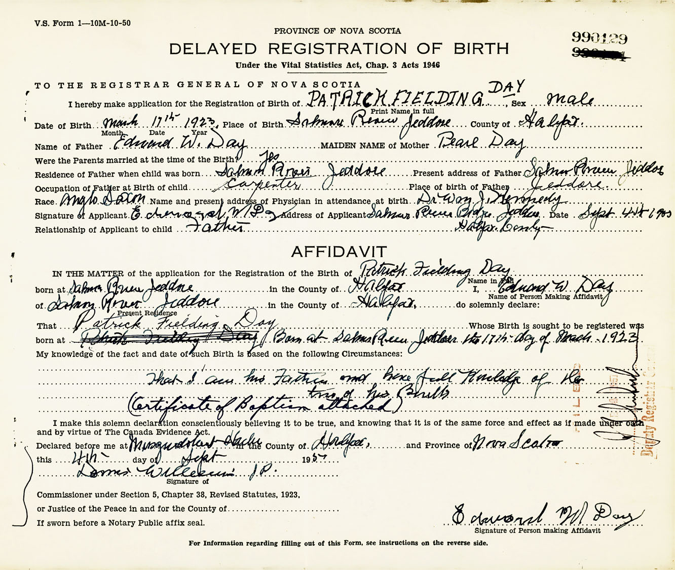 Date of Birth March 17, 1923 Place of Birth Salmon River, JeddoreCounty of Halifax