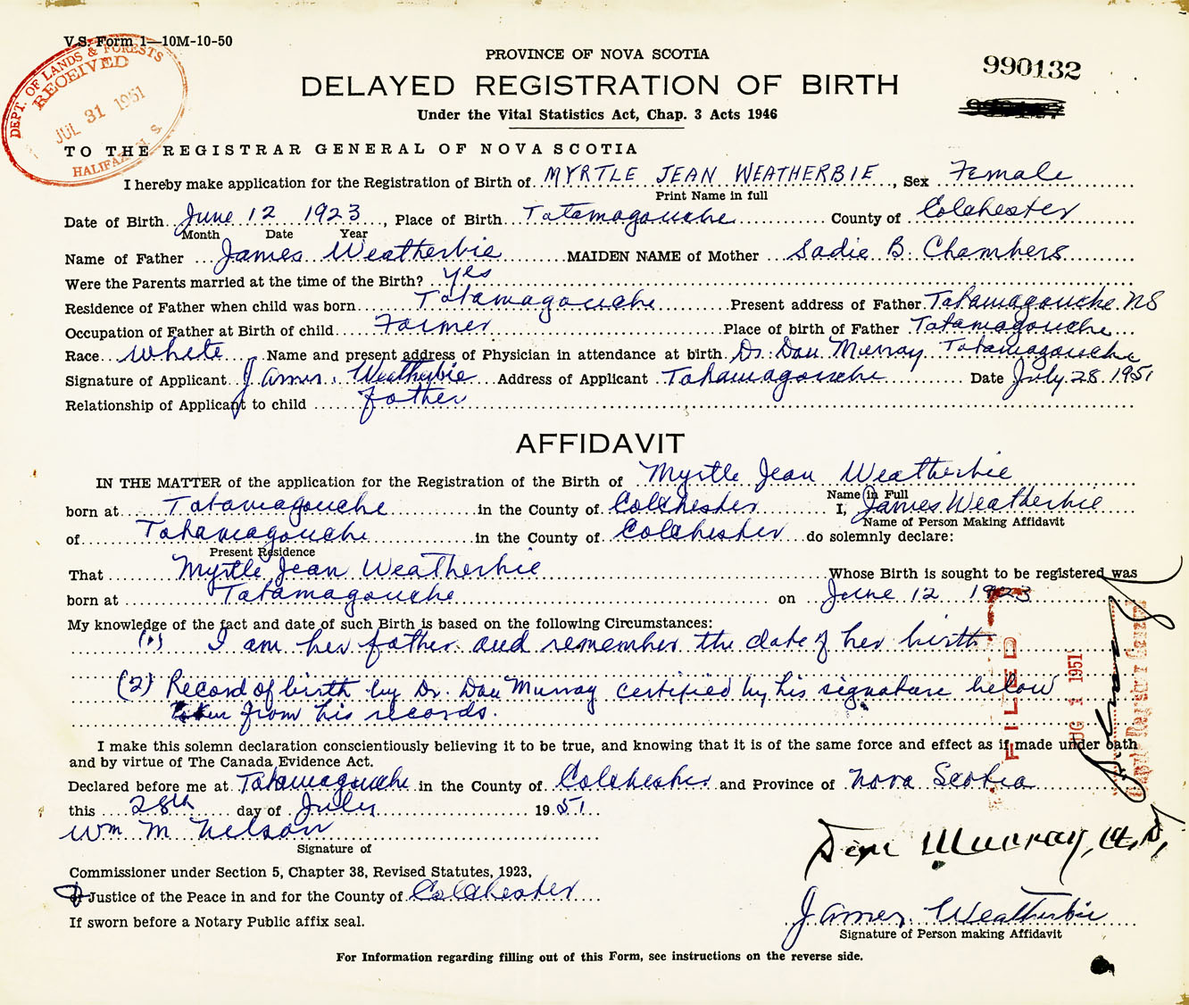 I hereby make application for the Registration of Birth of Myrtle JeanWeatherbie Sex Female