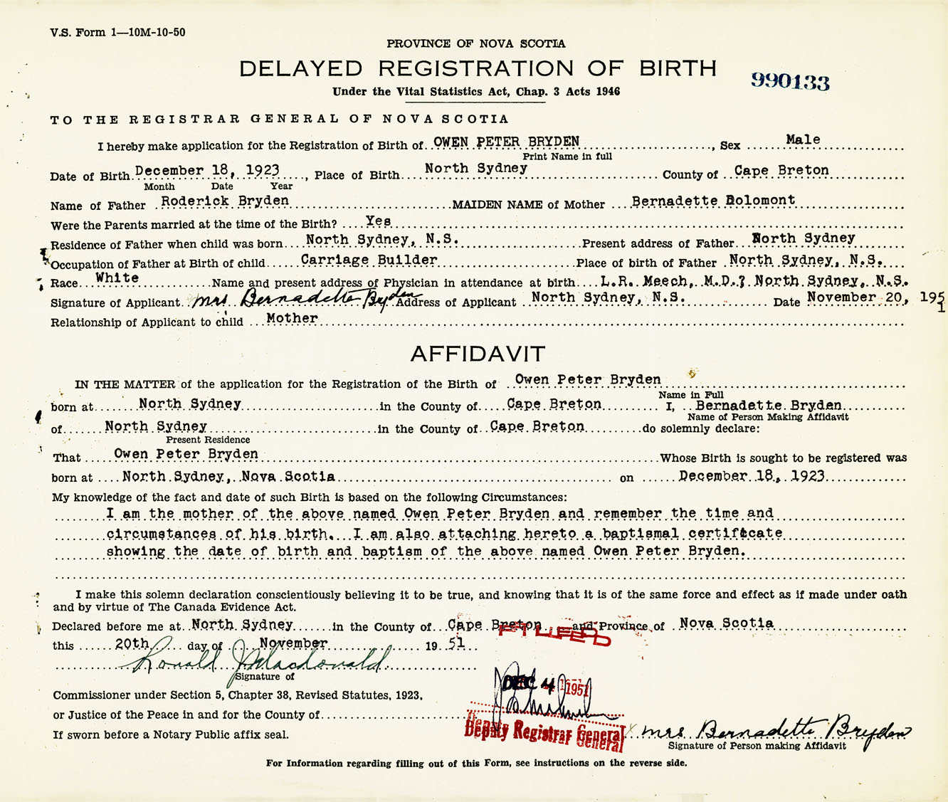 I am the mother of the above named Owen Peter Bryden and remember the time and circumstances of his birth. I am also attaching hereto a baptismal certificate showing the date of birth and baptism of the above named Owen Peter Bryden.
