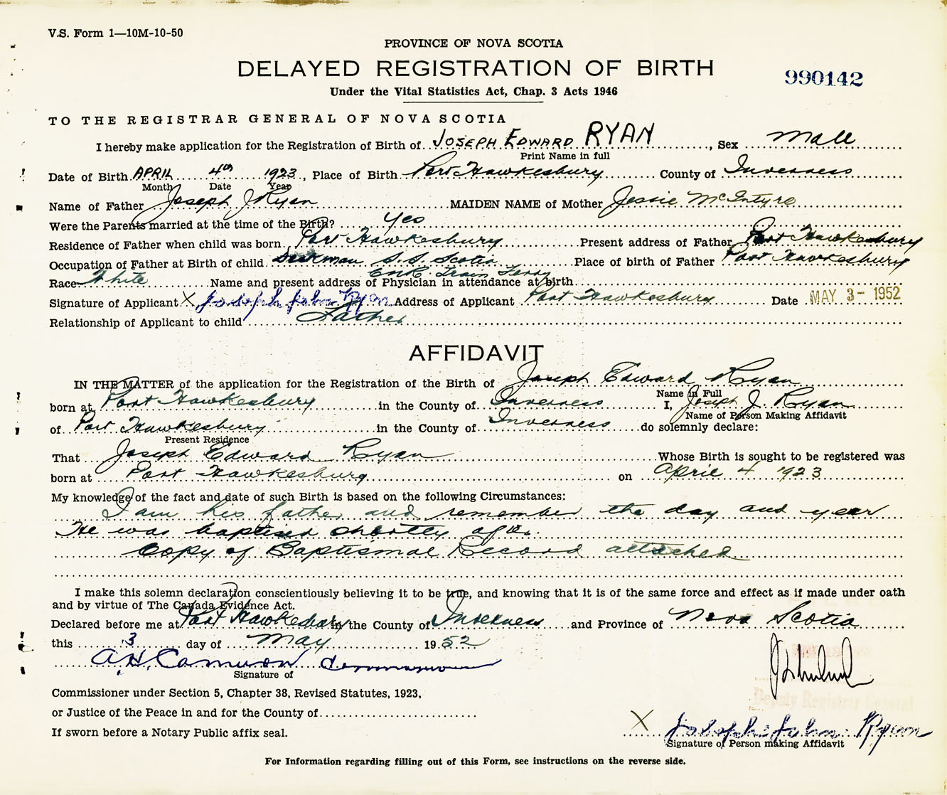 Signature of Applicant Joseph John Ryan Address of Applicant Port Hawkesbury, Inverness Co., NS Date 3 May 1952
