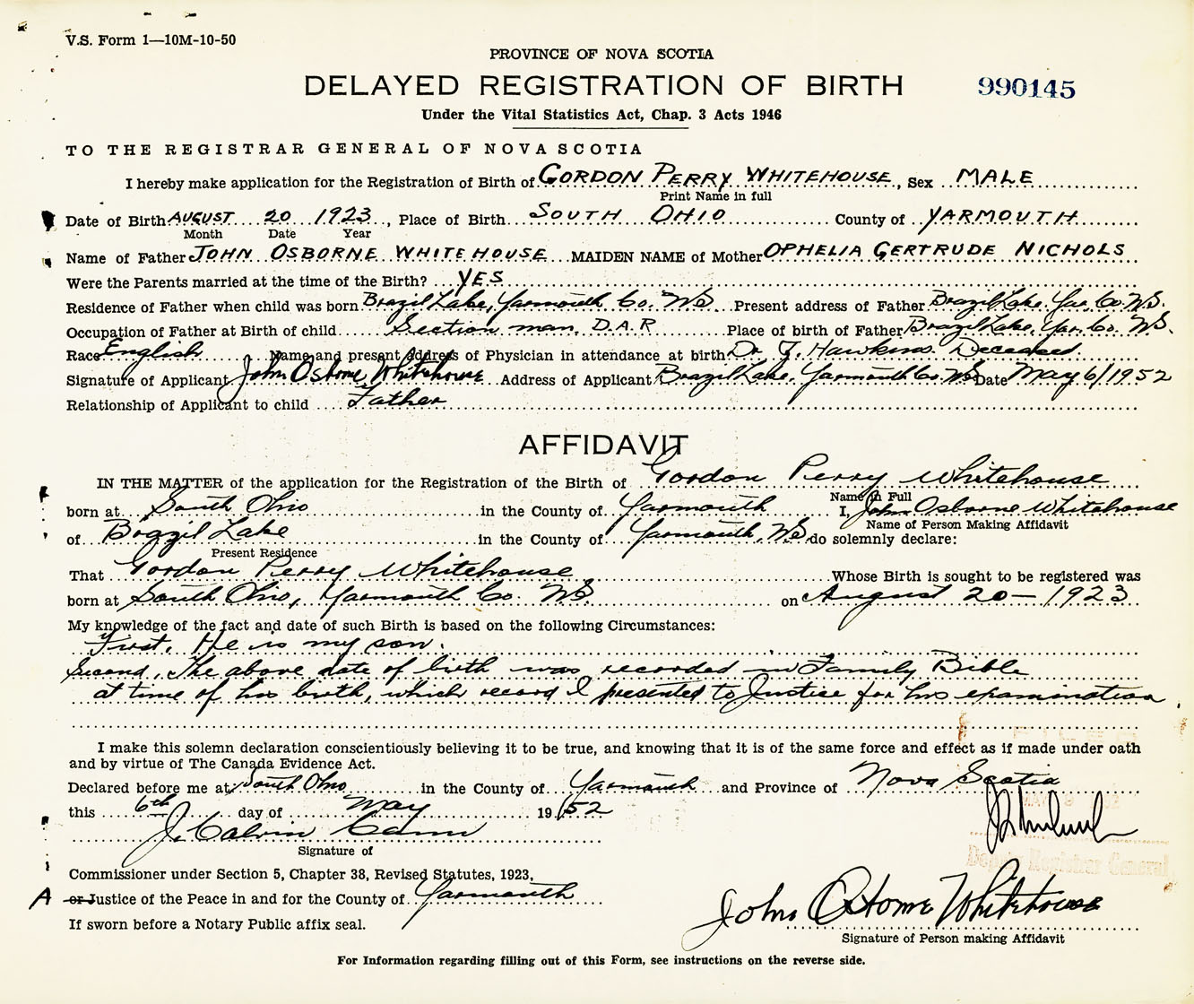 Signature of Applicant John Osborne Whitehouse Address of Applicant Brazil Lake, Yarmouth Co., NS Date 6 May 1952