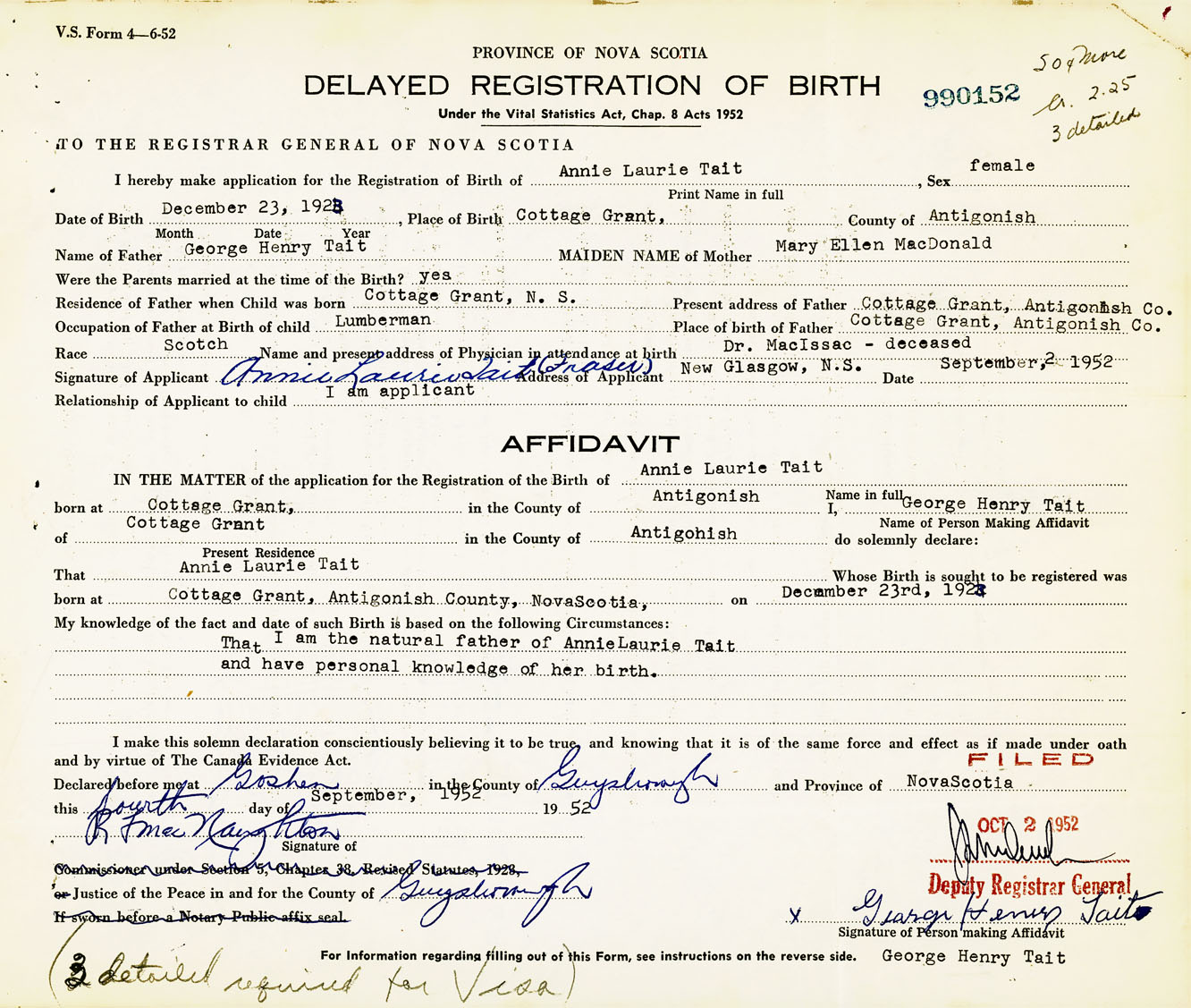 Name of Father George Henry Tait MAIDEN NAME of Mother Mary Ellen MacDonald