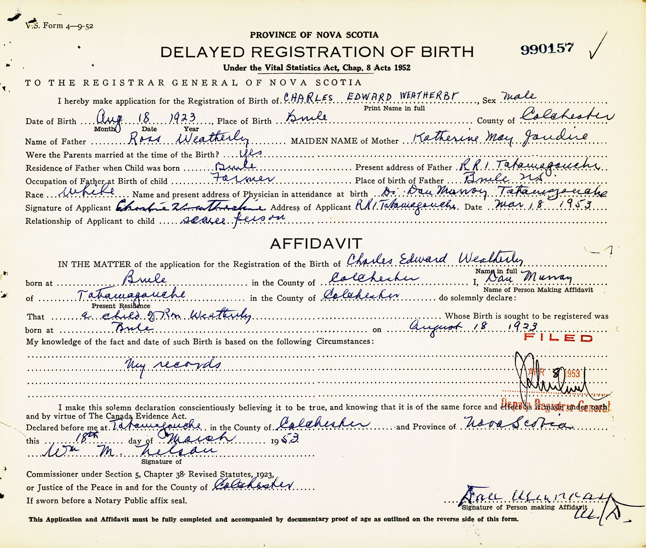 Signature of Applicant Charles Weatherby Address of Applicant RR #1, Tatamagouche, Colchester Co., NS Date 18 March 1953