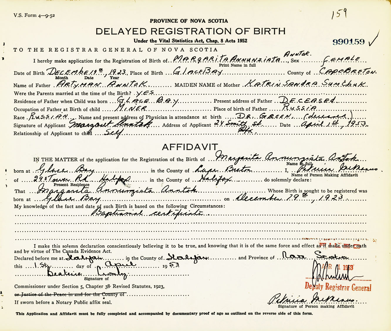 Signature of Applicant Margaret Anntok Address of Applicant 24 Smith Street, Halifax, NS Date 1 April 1953
