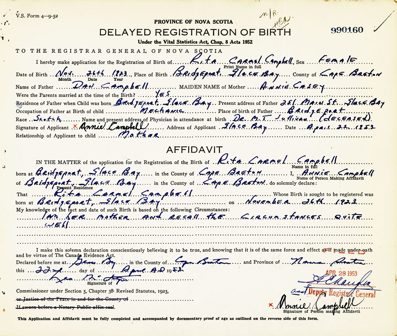 Signature of Applicant Annie Campbell Address of Applicant Glace Bay, Cape Breton Co., NS Date 22 April 1953