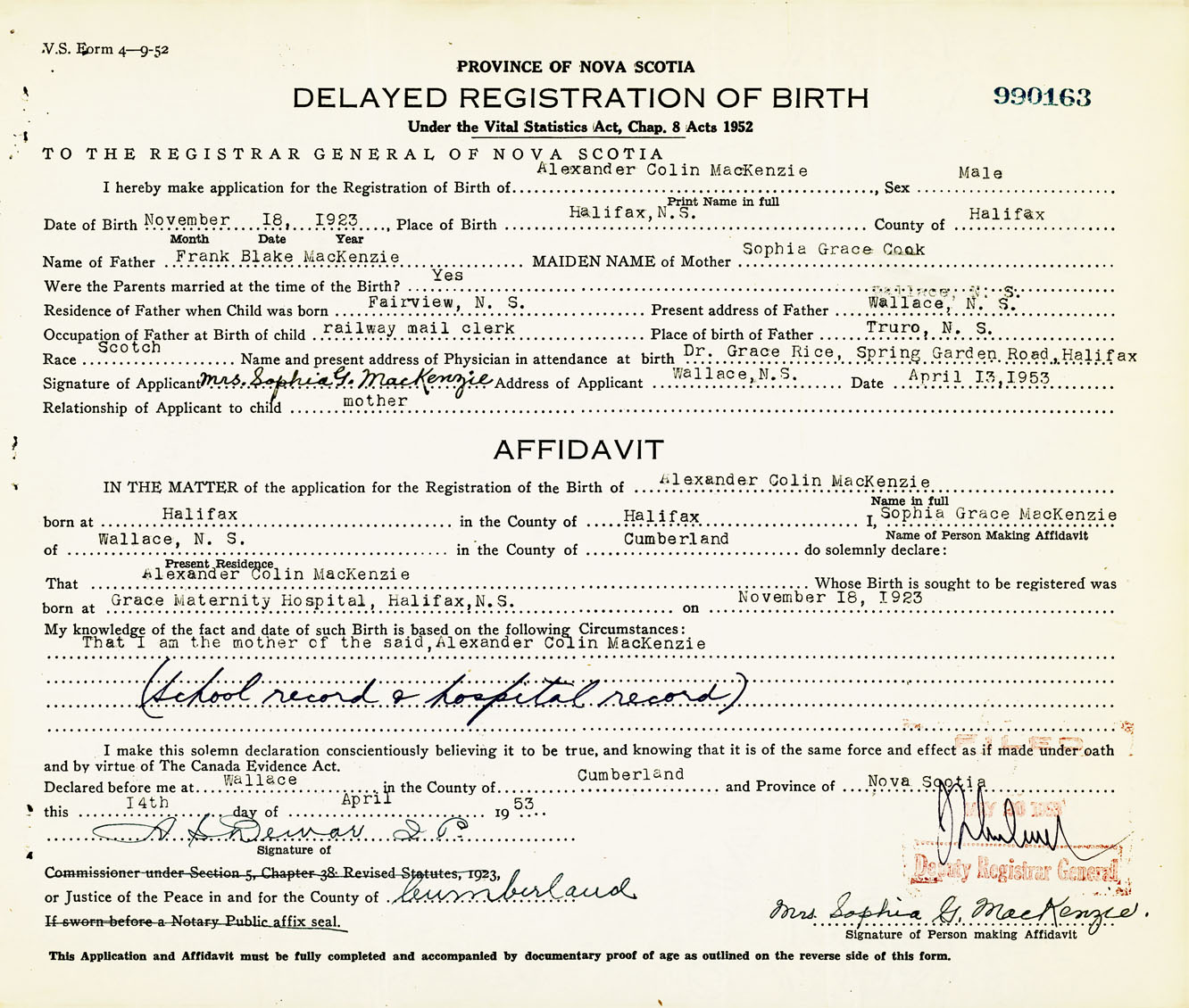 That I am the mother of the said Alexander Colin MacKenzie (School record and hospital record)