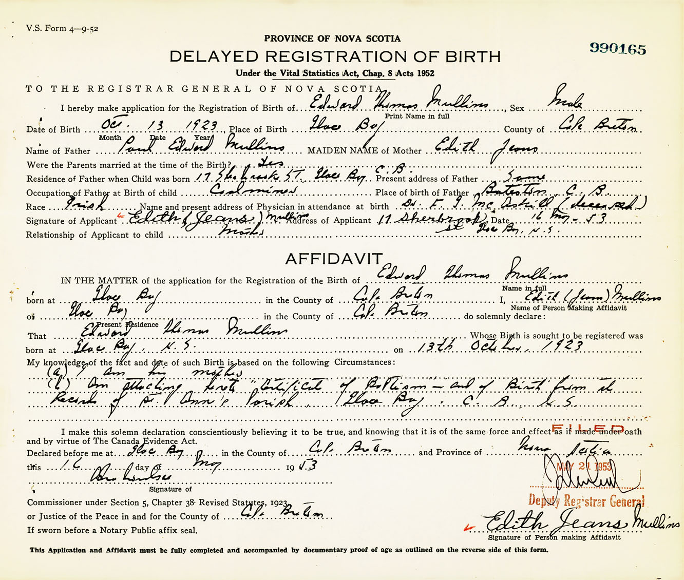 Signature of Applicant Edith Jeans Mullins Address of Applicant 17 Sherbrook Street, Glace Bay, Cape Breton Co., NS Date 16 May 1953