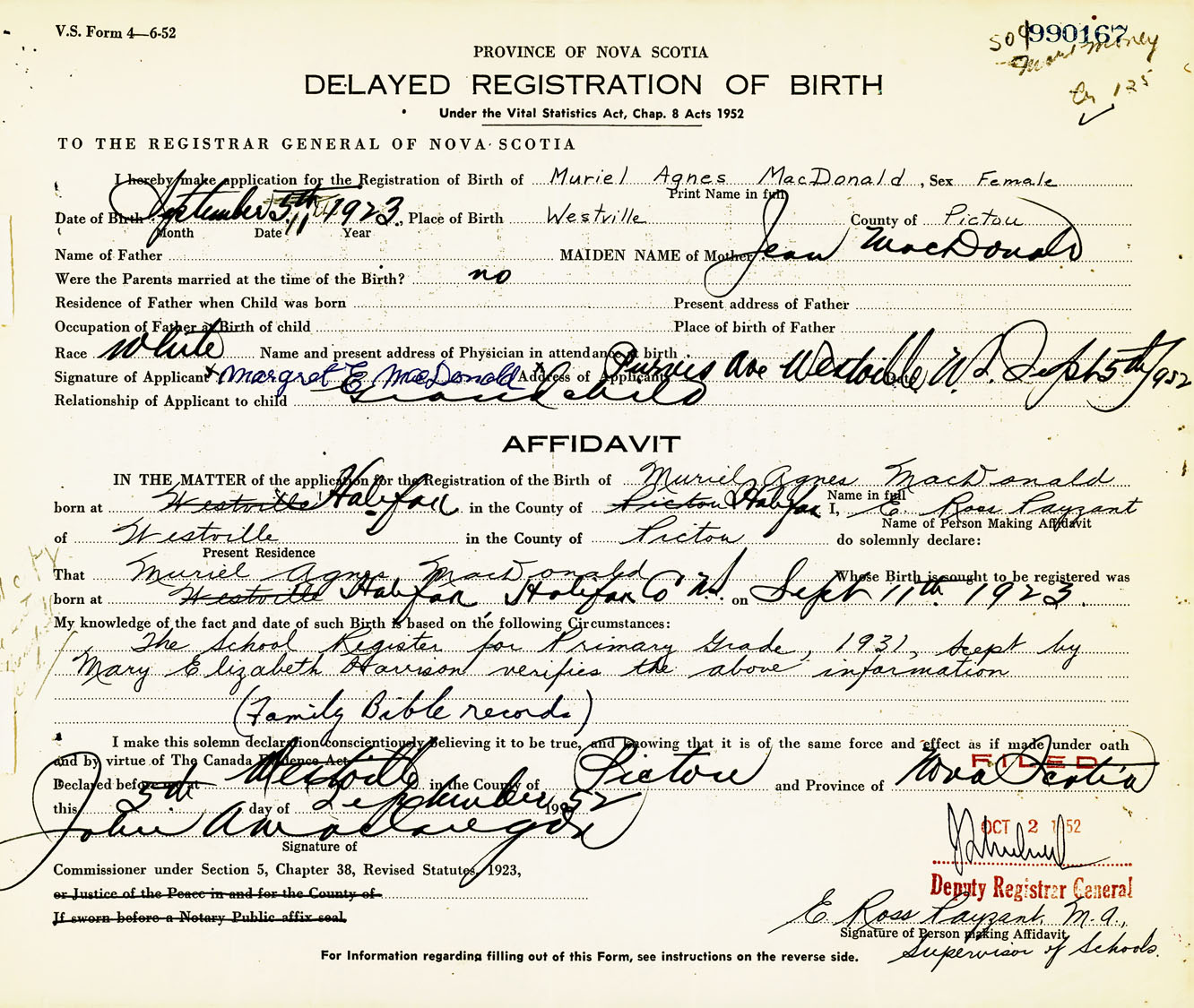 Signature of Applicant Margaret E. MacDonald Address of Applicant Purves Avenue, Westville, Pictou Co., NS Date 15 September 1952