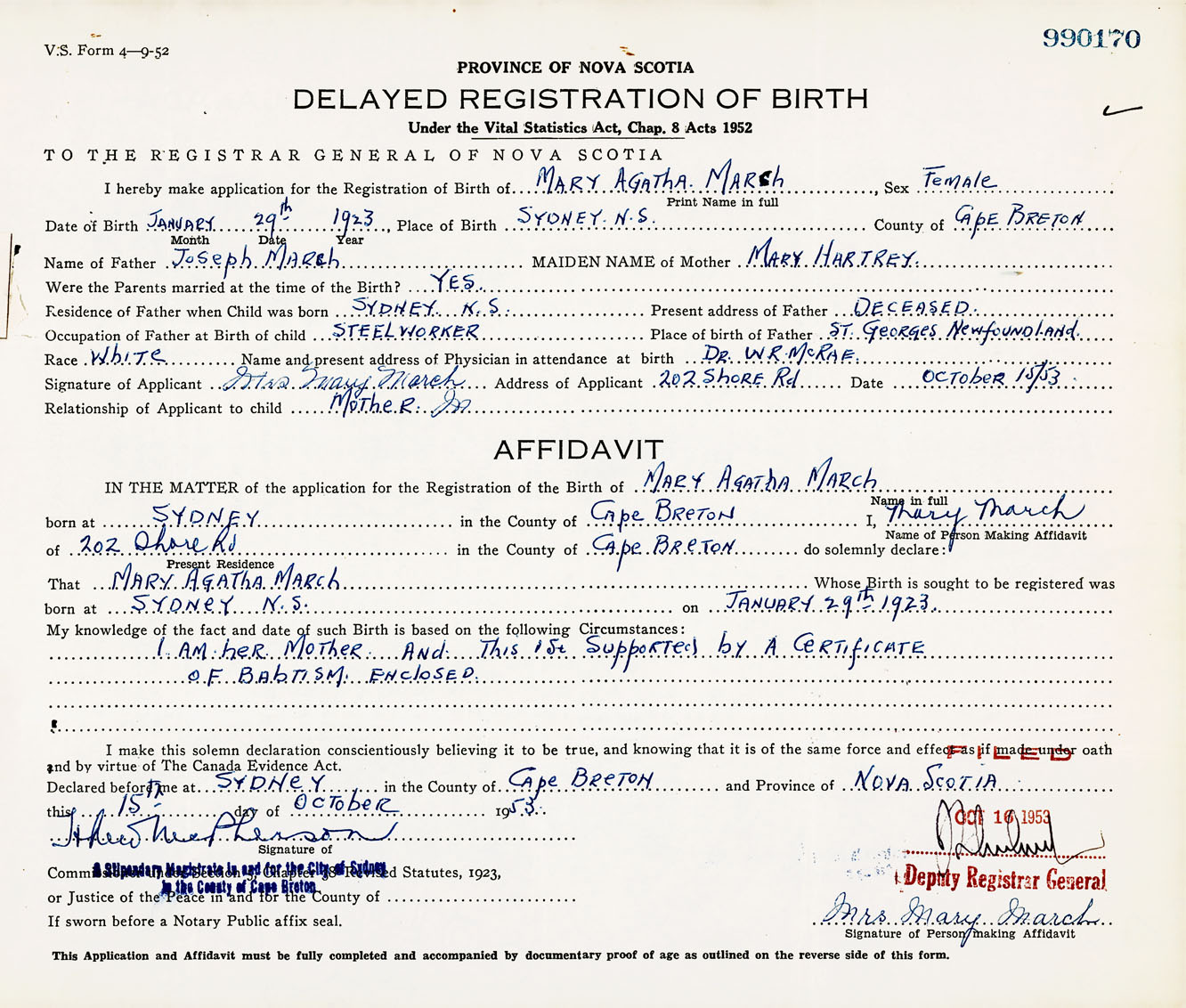 Signature of Applicant Mrs. Mary March Address of Applicant 202 Shore Road, Sydney, Cape Breton Co., NS Date 15 October 1953