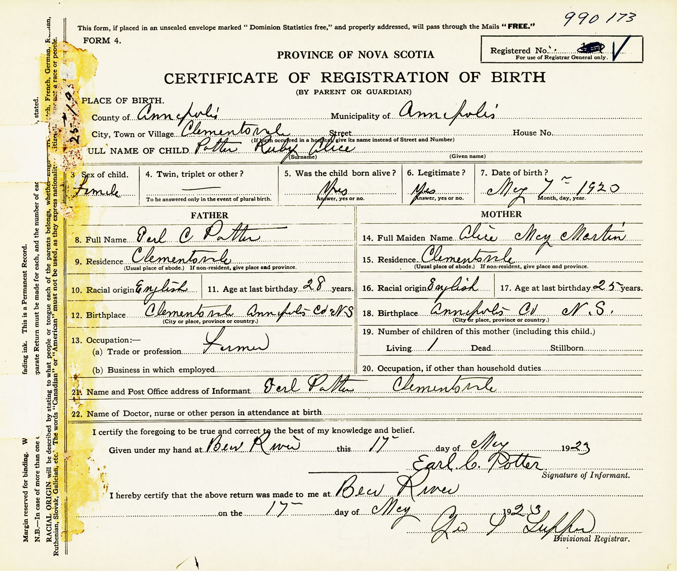 Date of Birth May 7, 1923 Place of Birth ClementsvaleCounty of Annapolis