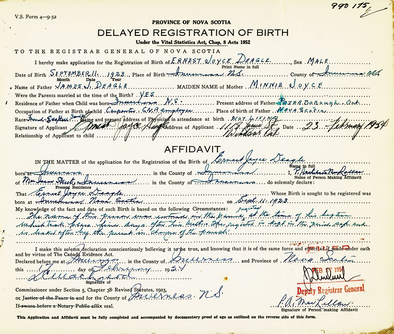 Signature of Applicant Ernest Joyce Deagle Address of Applicant 1118 James Street, Windsor, Ontario Date 23 February 1954