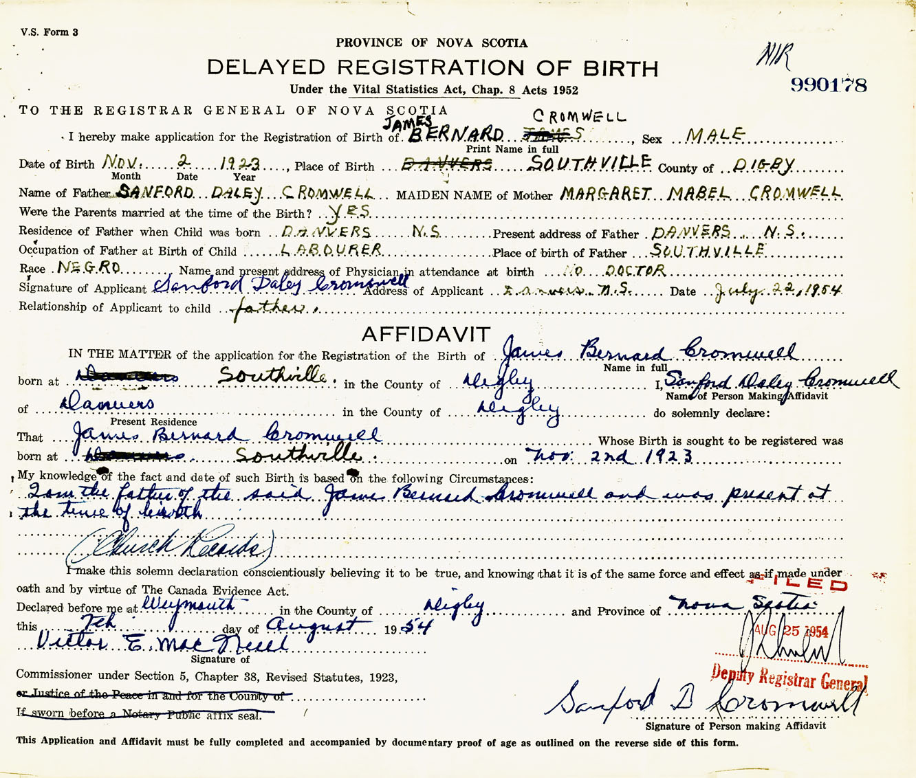 Signature of Applicant Sanford Daley Cromwell Address of Applicant Danvers, Digby Co., NS Date 22 July 1954